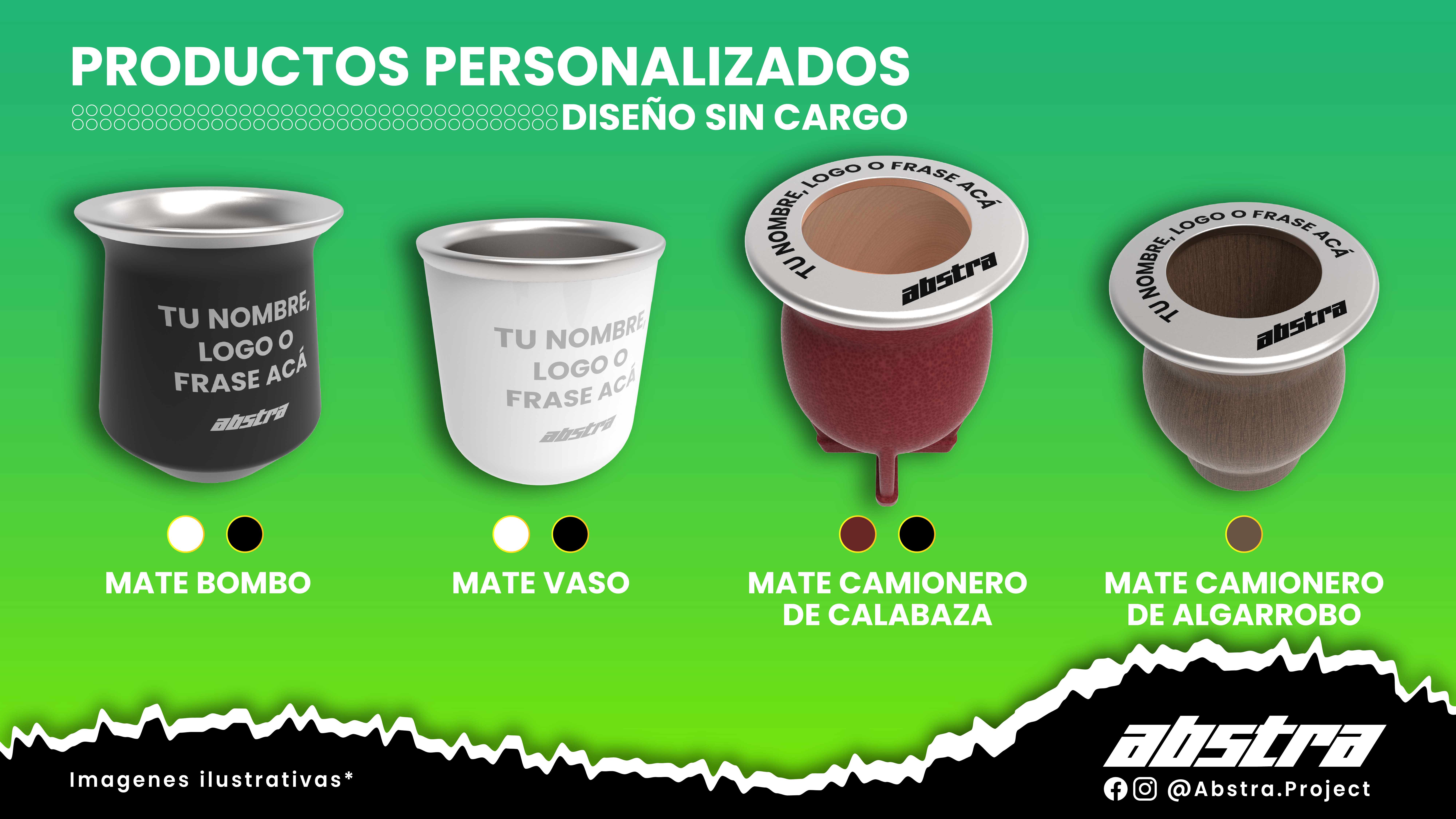 En Abstra realizamos mates grabados con diseño personalizado al por menor y mayor. Estos se gestionan mediante chat de WhatsApp, donde compartimos el catalogo de los mismos con su precio, y gestionamos el diseño y su compra.